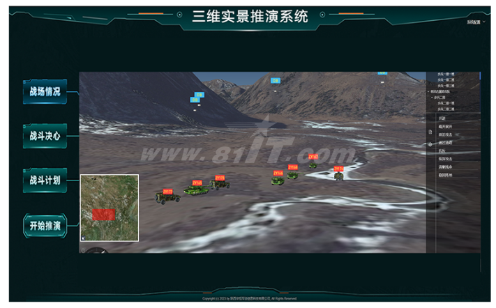 三维实景战斗推演系统是一种模拟战斗场景的计算机系统,它使用三维图形技术来模拟战场环境、作战单位和战斗行动。该系统通过构建三维战场模型,能够模拟出各种地形、建筑物、植被等环境元素,以及不同类型的作战单位,如步兵、坦克、飞机等。这些单位可以根据预设的规则和参数进行行动,模拟真实的战斗过程。系统通常具备实时渲染能力,能够以高帧率呈现复杂的战场场景,提供逼真的视觉效果。同时,它还具备交互性,允许用户通过输入设备进行操作和控制,参与到战斗过程中。