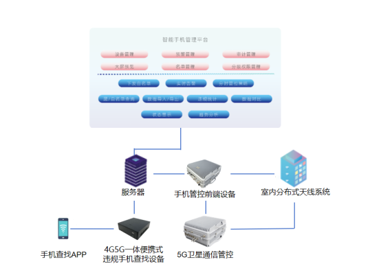 本系统由前端主机设备(手机管控前端设备、名单录入设备)、室内分布式天线系统和智能手机管理平台组成,同时可扩展便携式违规手机查找设备和手机查找APP。