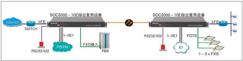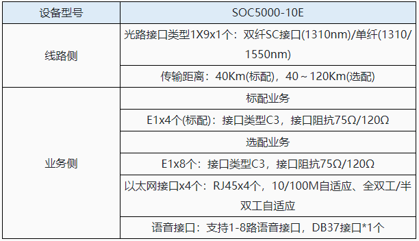 SOC5000-10E系列复用设备是在SOC-G08系列台式多业务光端机的基础上,增加了网口数量。此系列产品主要提供4/8个E1,1至4路带宽100M网口,1路异步数据,4/8路语音,专为语音和数据接入及专网组网建设而开发设计的综合业务传输产品,还能附加上其它业务,比如:2/4线音频、磁石通道、E&M通道等.采用标准19英寸1U机箱,双电源供电,满足专网建设中2M、以太网、语音和异步数据等综合业务的接入和传输。