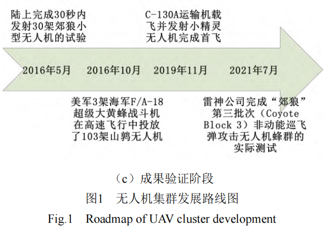 21世纪以来,无人机集群作战概念在美国空军、美国国防部、美国国防预先研究计划局(DARPA)等组织机构中被反复提及,制定了一系列的发展战略,总体来看可分为概念提出、理论研究、成果验证三个阶段,如图1所示。