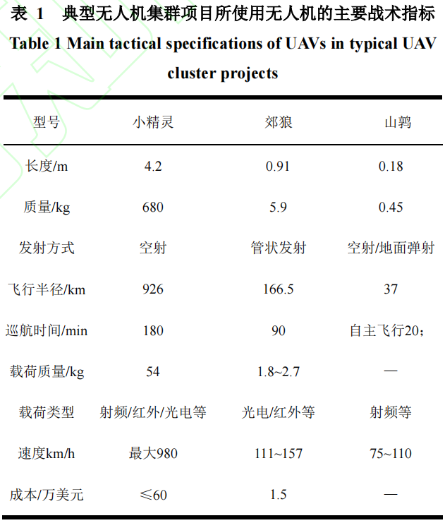 美国已率先开展多项无人机集群作战研究,其中的小精灵(Gremlins)项目、低成本无人机蜂群技术(LOCUST)项目和山鹑(Perdix)项目颇具代表性[4-7]。典型无人机集群项目所使用无人机的主要战术指标如表1所示。