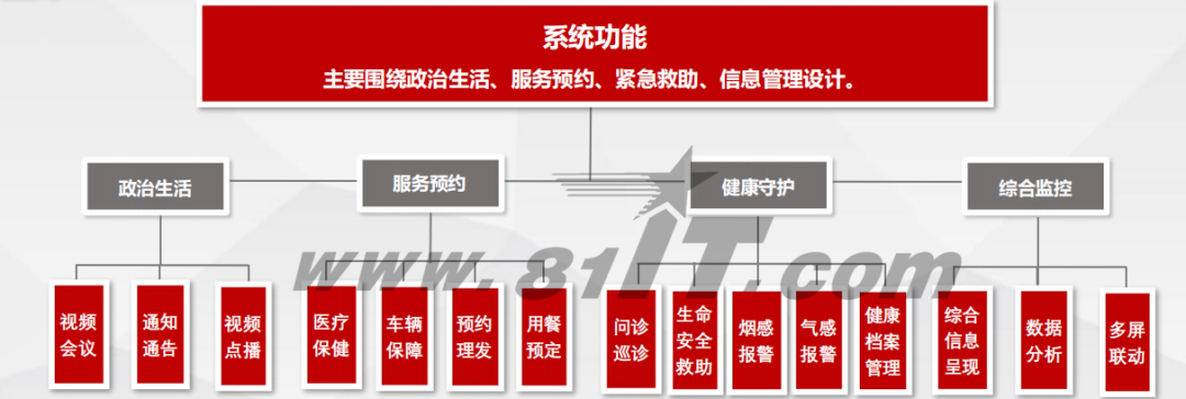 3、保障老干部健康和生命安全。由于干休所老干部数量大、居住分散,医护干部少,问诊巡诊及时掌握老干部健康状况难度大;特别是部分老干部日常处于独居状态,无人看管,若发生意外,得不到及时处置,威胁生命安全,平台通过线上巡诊、居住环境监测、紧急呼救系统等,为老干部提供生命安全保障。