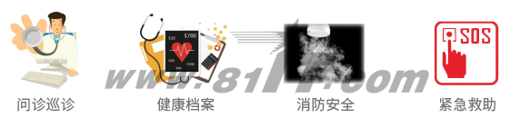紧急救助系统:一是语音呼叫。老干部随身配有紧急呼叫器,当发生紧急情况时,通过SOS按钮一键过程呼叫值班医生(已建设)。二是视频呼叫。老干部通过智慧终端呼叫值班医生,值班人员通过视频了解现场情况,作出救助处置。