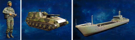 平台中集成海量的军事资源模型,用户可以借助系统提供的查看工具对资源库的模型进行浏览,包含我军、美军、台军、印军等敌我双方多数主流武器装备及工事建筑等。可多角度对模型进行查看,更好地了解其外观和构造,可根据资源库预设的分级方式对作战单位进行分类检索,包括武器装备、作战人员、军事建筑和工事模型等,素材还可以按三维通用格式导入/导出,方便用户备份、修改、跨平台使用。