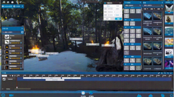 内容编辑包括作战单元创建、对象属性编辑、对象行为逻辑编辑及镜头编辑等。用户可以根据脚本或想定部署敌我双方人员及武器装备;编辑参战单元属性、设定单元触发条件和行为、编辑单元和控制单位之间的关系;创建单元的行为事件链,通过时间轴或事件轴按时间顺序和逻辑方式来完成对象的事件编辑,完成脚本部署;创建和调整镜头,实现运镜、切镜及多机位拍摄等。