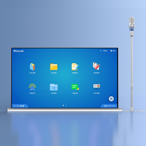 威数智能的STIM超薄锋刃集成发言一体升降触控屏显示终端设有4K超清屏幕,采用CNC工艺,集成了高清摄像头和激光红外键盘,适配Zoom平台完成独立的视频会议。