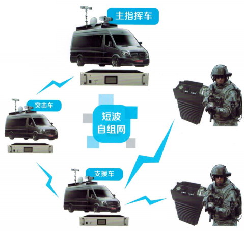 采用具有自主知识产权的无线组网协议算法以及新一代COFDM硬件平台研发的无线宽带自组网系统。该系统设计精巧,便于车载和单兵携带。在公共网络被限制等复杂环境下,多台自组网设备通过自组织方式迅速建立起一个同频、无中心、多跳的自组织网络,使指挥车与指挥中心、其它信息支援车、单兵设备之间实现数据/语音业务。