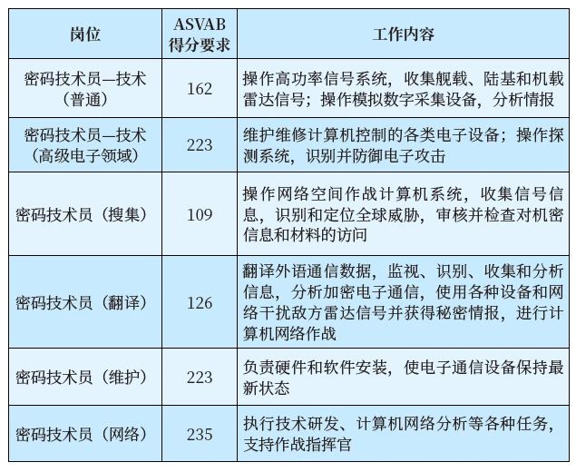 海军密码技术员为士兵群体,同样涉及五大方向,分别是技术、搜集、翻译、网络、维护,每类岗位按照级别又进行细分。士兵入伍前需要参加军事职业倾向综合测验(ASVAB),根据从事内容不同,对应的ASVAB得分标准也不同。