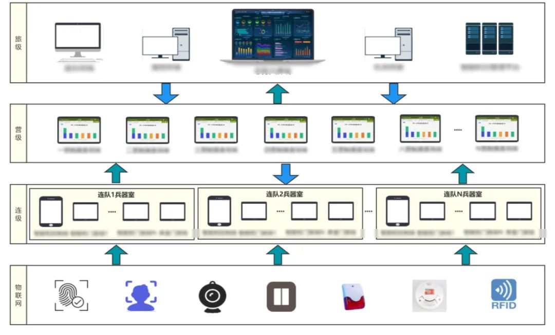 根据前期实际调研需求,本方案以军事物联网技术为基础,结合大数据技术,依托营区内部网络,设计“旅/营/连”三级架构的智能兵器室管理系统。