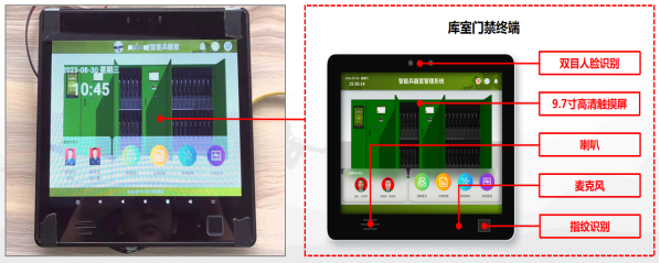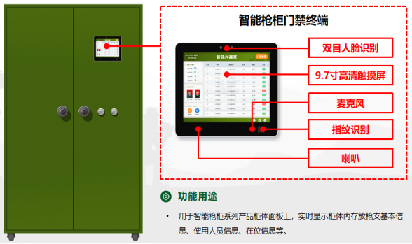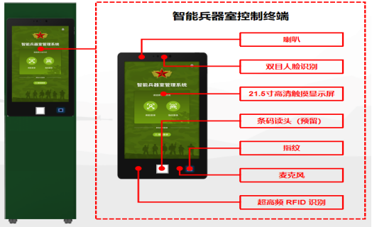 智能兵器室门禁端部署在连队兵器室门侧,采用一体化设计,对兵器室管理人员进行分级授权,实现兵器室门禁“双人双验证”、室内监控远程实时预览、装备数质量库外查验和系统维护等功能。