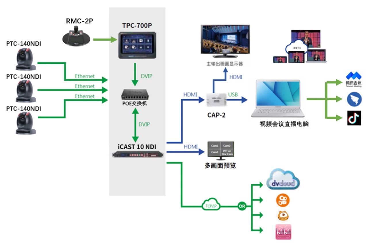 同时在会议主会场现场,导播通过TPC-700P POE智能交互触摸屏,简化控制方式,实现摄像机和信号的便捷切换,满足多元化的系统应用。这一切,都得益于洋铭NDI技术直播解决方案。