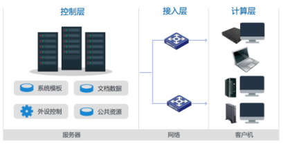 终端桌面系统与终端电脑硬件分离,由服务器端为终端分配包含应用的镜像系统,终端机器不再是资源中心,而只是计算中心,承担着桌面运行的计算任务,它将根据服务器配给的系统镜像运行相应的桌面系统。
