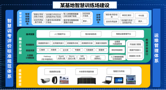 中电万维数字化军事体育主要由智慧应用层,服务支撑层,设施资源层组成。设备资源层主要涉及的设备有视频感知设备、AI体育专用服务器以及智能交互终端。服务支撑层涉及技术支撑,数据服务,数据资源,大数据计算框架与数据开放接口,其中技术支撑依靠于人工智能平台,智训参谋系统以及智能设备管理平台等平台,数据资源存放于汇集库、关联库、全文库、专题库、元数据库、配置库等相关库表,本系统使用了半结构化框架Hadoop,大数据处理引擎Spark以及一个开源的可以用于大量数据集的分布式实时数据计算引擎Storm,批处理框架MR,结构化框架MPP。智慧应用层主要是智慧训练场地管理系统与训考与评估课目。整体功能架构如下图所示: