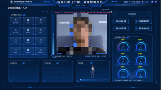 摄像机对被测人物进行视频分析,采用血流信息光学成像技术和视频图像微振动分析技术,并结合神经网络学、生物学和机器视觉原理,通过计算机分析摄像机采集的视频图像,实现对各项心理健康指标、生理健康指标以及心理素质评估指标的快速分析。被测人只需静坐在摄像机前,无需做题或答题,50秒内即可检测出7项生理健康指标、13项心理健康指标和27项心理素质指标,并自动生成检测分析报告。此技术能迅速发现心理和生理健康问题,并全面评估心理素质,为医生的及时介入和明确心理疏导方向提供有力的参考依据。