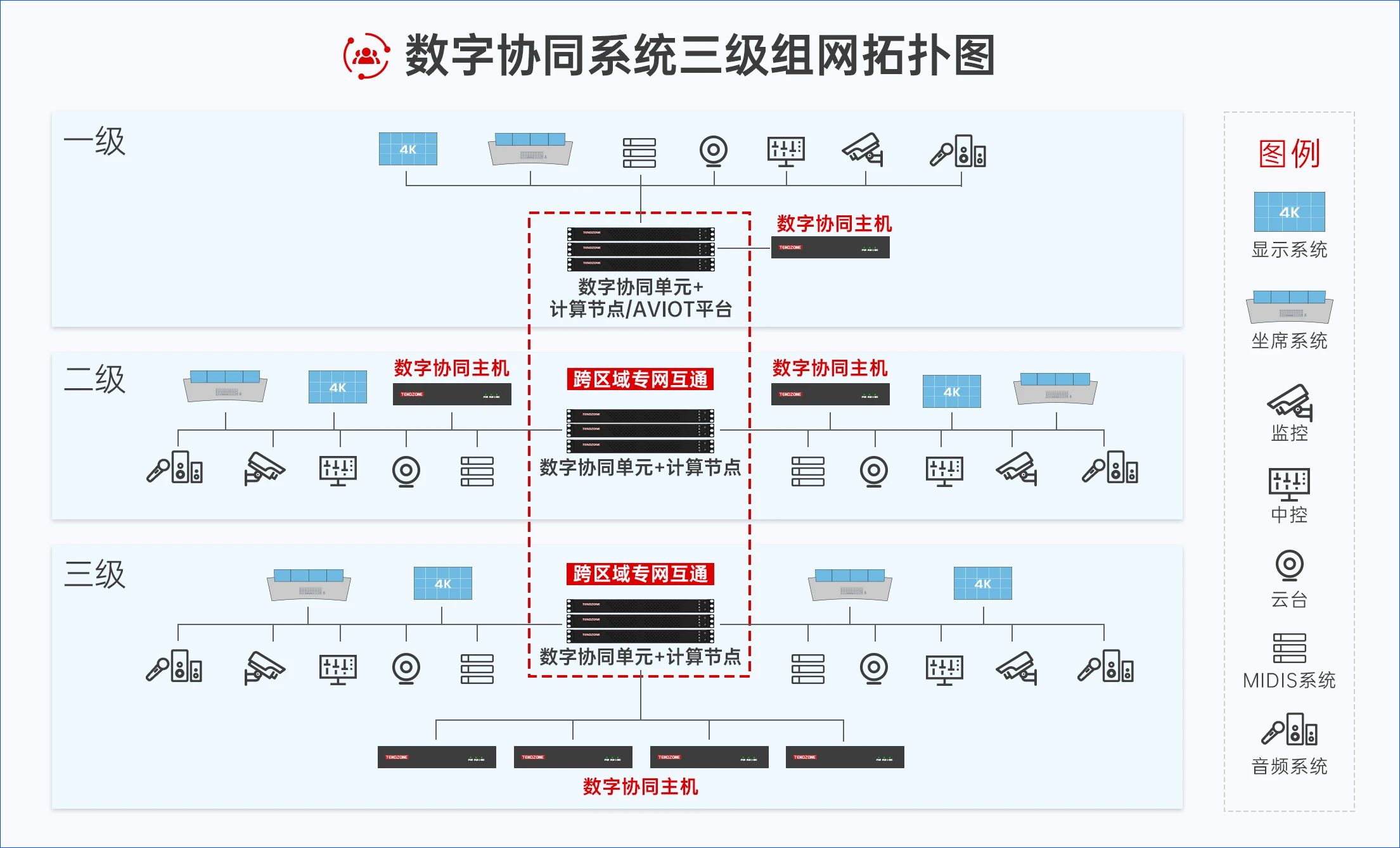 在应急、人防等关键领域,指挥中心的建设通常采用多级组网架构,不同地域之间通过专网拉通,旨在实现“看得见、听得到、指得动”的核心目标。然而,当前主要通过视频会议加矩阵的方式实现多级互通,存在操作复杂、响应速度慢等痛点。当一线指挥中心需要快速调取某一路信号源时,往往需要经过冗长的手动对接过程,这不仅降低了指挥调度的效率,更在紧急情况下可能错失最佳处置时机。