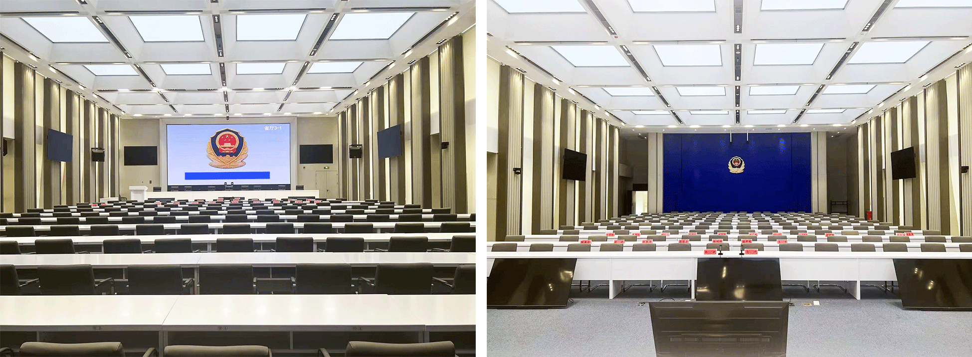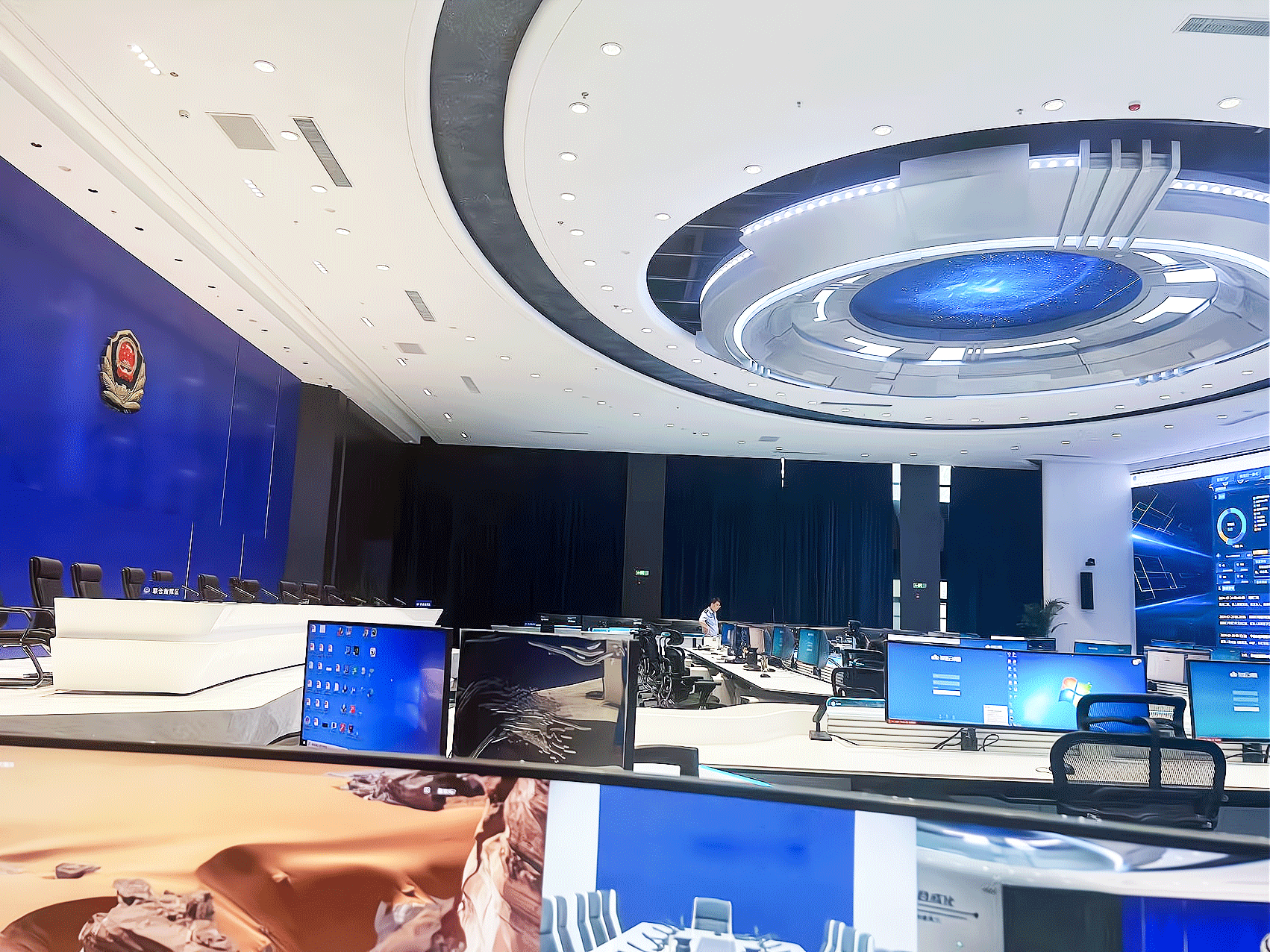在情报指挥中心,分有坐席区域、指挥调度区域,显示区域,会商区域等,通过对图像信号管理系统、中央控制系统等的音视频建设,使情报指挥中心建设为集系统高度集成,高效协作,信息互联共享等为多功能一体的第三代公安情指勤舆指挥中心。