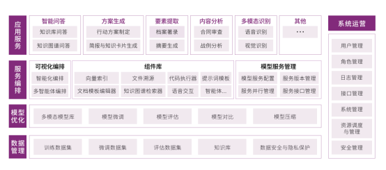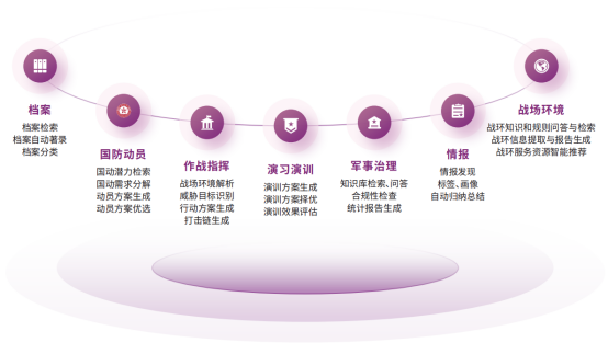 业务成长演化,平台提供大模型仓库,基座大模型可以随着技术进步而升级或替换。另外平台还提供60+项国防应用任务构建所需的工具,通过简单的流程编排即可实现后勤保障行动方案制定、军事公文写作、档案知识服务等多样的大模型+国防业务场景应用,可编排的业务流程使得平台能够对未来业务变化快速响应,保护已有投资价值。