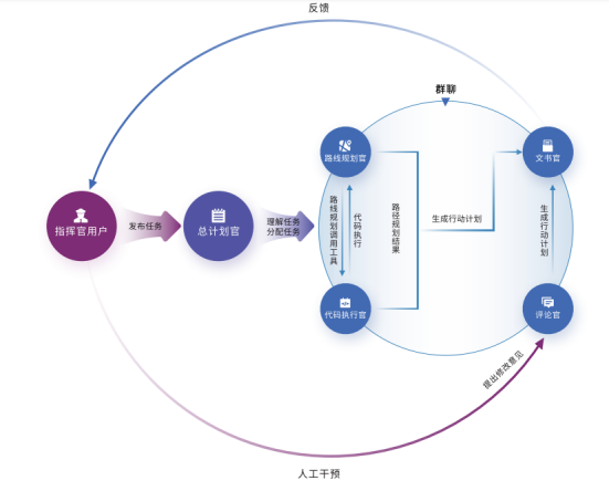 系统人机协作,对于复杂业务平台提供了基于大模型的多智能体框架,采用角色模拟、工具调用和人在回路的组合设计,使得多个智能体之间能够自主配合,同时智能体也能与人类指挥官进行交互,通过人机协作完成复杂的综合、组合型任务。