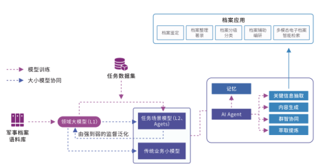 档案知识服务应用中采用了“大模型为中枢、小模型为骨干”的能力设计,由总体规划智能体自动完成意图理解、工具理解以及规划理解,自主组合调度领域大模型、任务场景模型以及传统业务小模型的能力。小模型能够快速准确地完成诸如关系抽取、实体识别等任务,在处理结构化数据和明显的信息抽取任务时效果显著。当任务涉及到需要更多背景知识、逻辑推理,需要深度分析时,就需要大模型来接管这些复杂的任务。大小模型合作可以充分利用各自的优势,实现能力的互补,协作完成档案鉴定、档案整理著录、档案分级分类、档案辅助编研、多模态电子档案智能检索等档案业务应用。