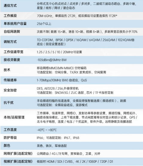 高速率:设备最高支持70Mbps速率传输,40M带宽分配,可以支持多路高清视频指挥调度等复杂业务通信;