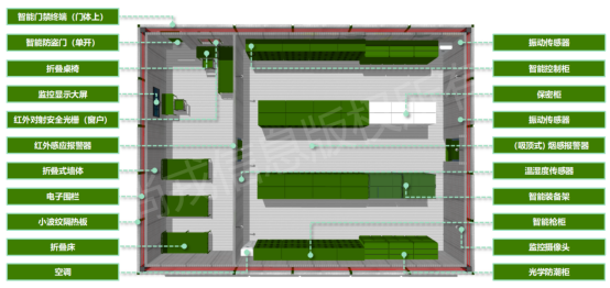 装备存放配置主要有野战枪柜48个、智能控制柜1个、光学器材柜6个、保密柜6个,装备(器材)架4个,空调2台、摄像头6~8个及多功能防盗门2樘,如下图所示。