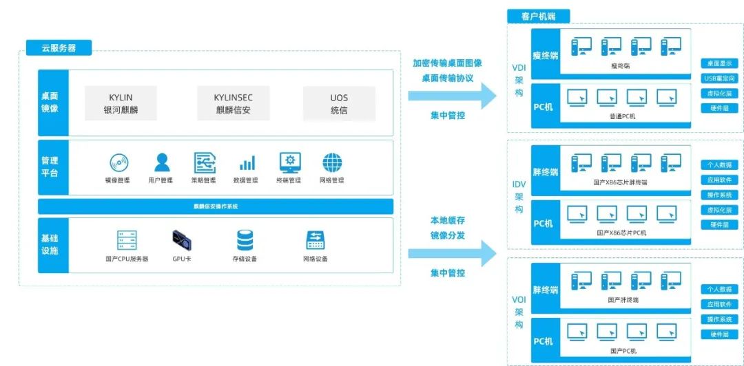 产品支持飞腾、鲲鹏、龙芯、海光、兆芯等国产自主CPU终端PC机、笔记本、瘦客户机等,后端支持飞腾、鲲鹏、海光等国产自主CPU服务器,虚拟机桌面支持银河麒麟、统信UOS等国产桌面操作系统。全量继承了各类办公软件、业务系统、各类外设等应用生态,为新一轮政务信创解决“易用、用好”问题形成了“湖南方案”,并走向全国。