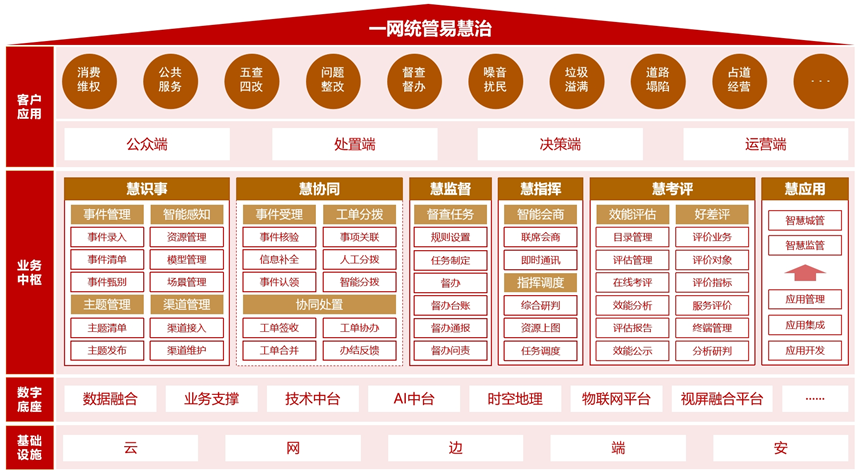 围绕政府治理和城市治理数字化改革,以视联网、物联网、大数据、大模型和AI等技术赋能,打造政府治理“高效处置一件事”的业务中枢,汇聚治理全要素,提供治理和运营标准体系,解决公众诉求“痛点”、社会治理“难点”、政府管理“堵点”,提升政府治理能力和治理体系现代化。