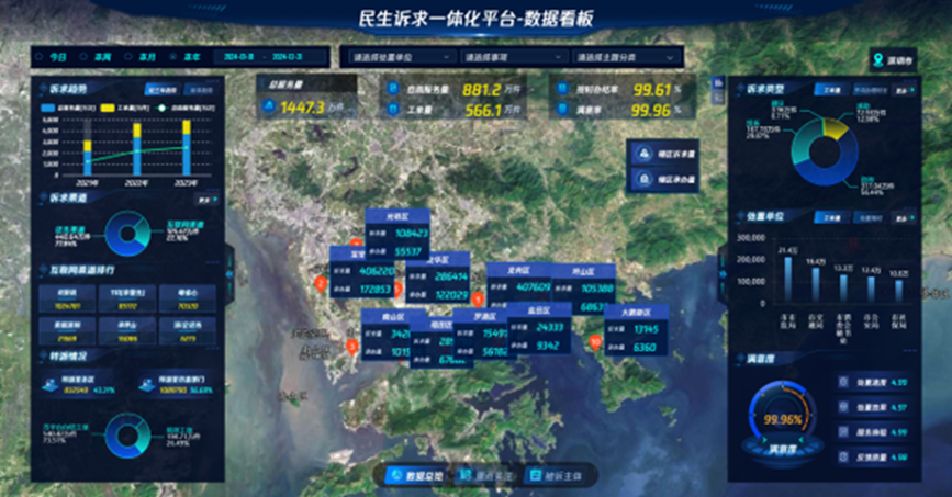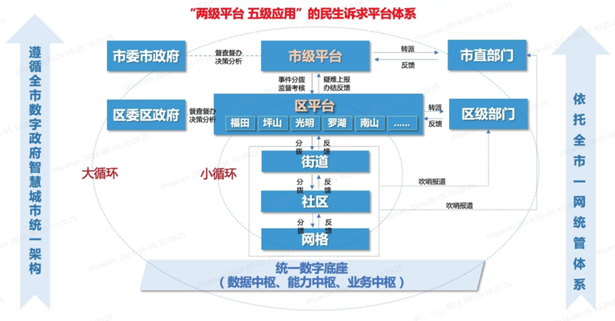 (1)建设背景:按照深圳市委书记孟凡利同志指示批示要求,形成《关于“以推进民生诉求‘一网统管’改革为切入口,深化以人民为中心的党建引领基层治理体系建设”专题调研报告 》,以“书记在线、民意速办”改革作为书记抓基层治理的“头号工程”。平台以“书记在线、民意速办”改革为突破口,以解决群众“急难愁盼”突出问题为方向,按照“统一入口、一体分拨、分级处置、综合评价”的模式,综合运用大数据、人工智能、区块链等技术,打造“数据驱动、一体协同、智能高效、安全可控”的民生诉求一体化平台。