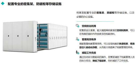 美电贝尔智能密集架集成了计算机技术、网络技术、通讯技术、机械技术、自动化控制技术等多种技术,实现了档案的自动化管理。密集架可以根据档案管理人员的操作自动完成档案的存取、管理、盘点等任务,显著提高了档案管理的效率和准确性。智能密集架配备电动驱动系统,使得档案的存取更加方便快捷,与传统档案柜相比,智能密集架可以更有效地利用空间,可以根据需要进行扩展或缩减。