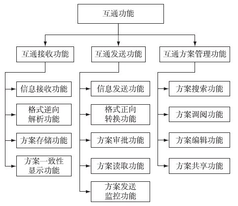 其中,方案互通接收功能包括信息接收、方案互通格式逆向解析、方案存储、方案显示功能方案互通发送功能包括信息发送、方案互通格式正向转换、方案审批、方案读取、方案发送监控功能;方案管理功能包括方案信息的搜索查询、方案调阅、方案增删改编辑功能、方案共享。