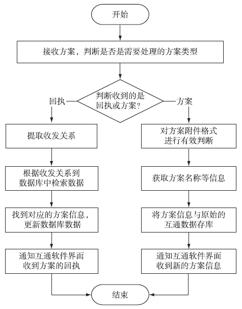 方案互通的主要流程由方案接收流程、方案发送流程和方案转发流程组成。方案接收流程是接收到互通方案后进行的信息处理流程;方案发送流程是发送互通方案的信息处理流程。