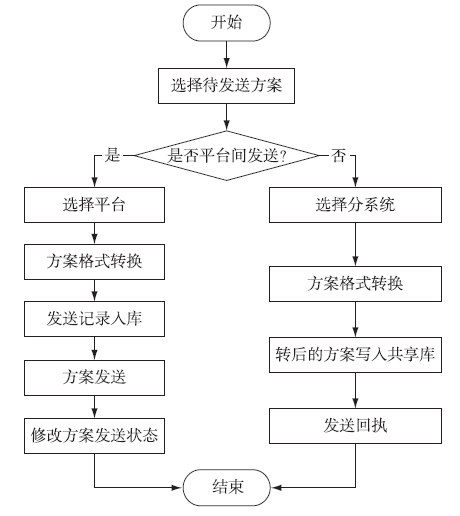 当向其他平台或平台内部发送作战方案时,选择待发送方案、平台名称、互通协议格式和审批选择信息,将该方案发送至其他平台,记录在收发数据库中。方案互通发送软件流程示意图如图10所示。