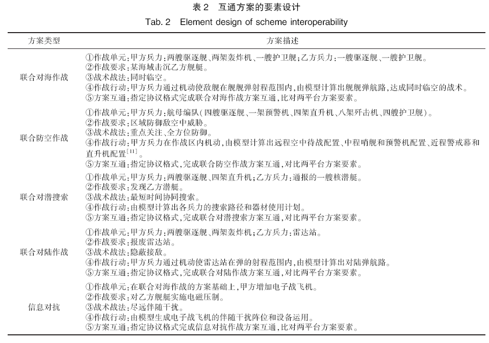 笔者通过分析五个方面的能力特点,采用互通软件一致性描述规则,设计典型的联合作战方案要素。具体如表2所示。