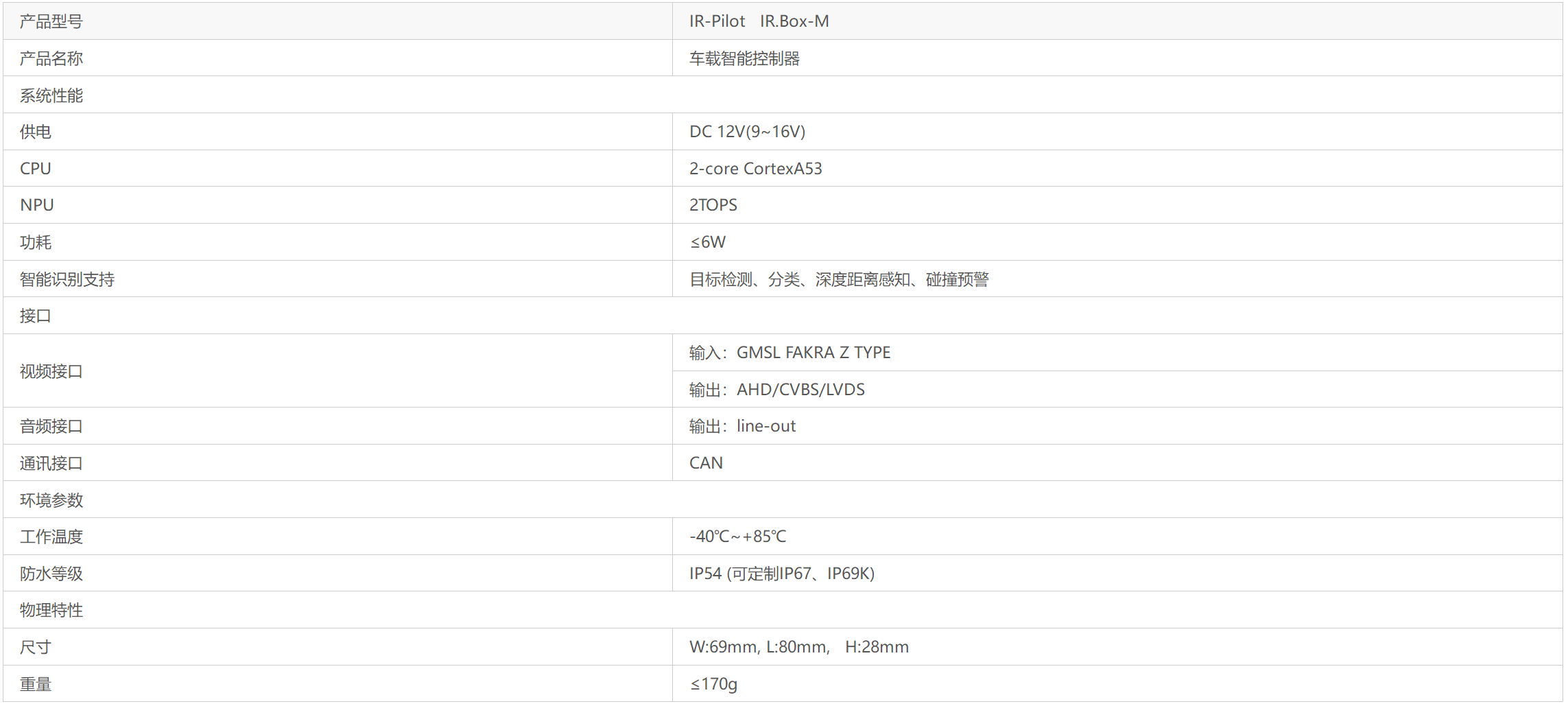 IR-Pilot IR.Box-M是专门为汽车市场研发的高性价比智能辅助驾驶产品,支持多种视频输出接口,配合前端红外模块打造一体化前后端智能预警方案,可满足乘用车、商用车、特种车辆等在无光、强光(远光炫目)、雾霾天、雨雪天等极端情况下对目标识别、碰撞预警的需要。
