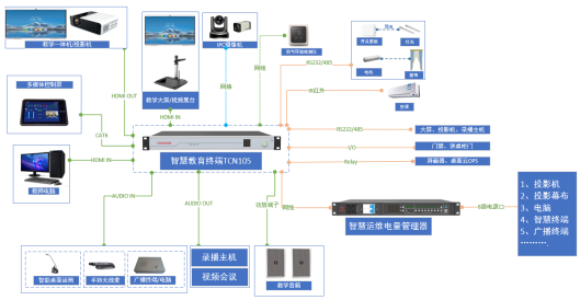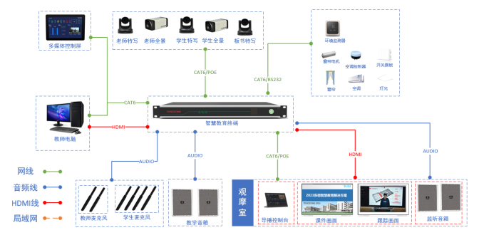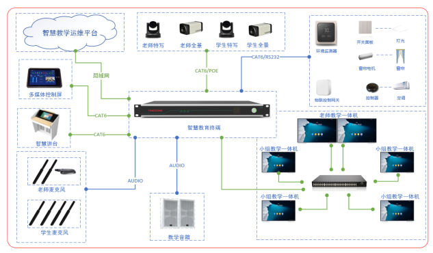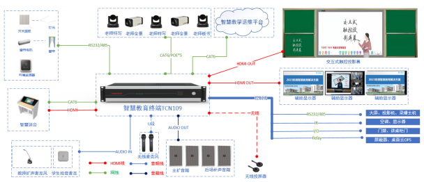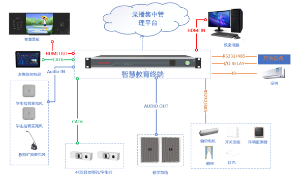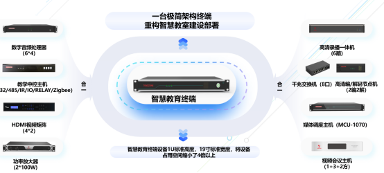 集成音频处理、数字功放、视频矩阵、教学中控、自动录播、教学互动、视频互动、物联控制、POE交换机功能于一体。