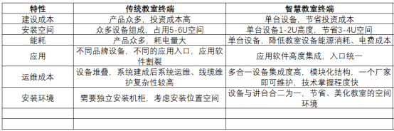 多媒体智慧教室,该类型教室在智慧教室数量数量众多,教室使用率最高;主要以教学扩声、显示控制、多媒体物联控制为核心,实现教室内设备的智能化无感控制;在系统解决方案中,以智慧教育终端为核心,实现多媒体智慧教室设备功能教学扩声(音频处理器+功放)、教学中控、视频矩阵、媒体处理、物联控制、POE千兆网络交换机等功能。
