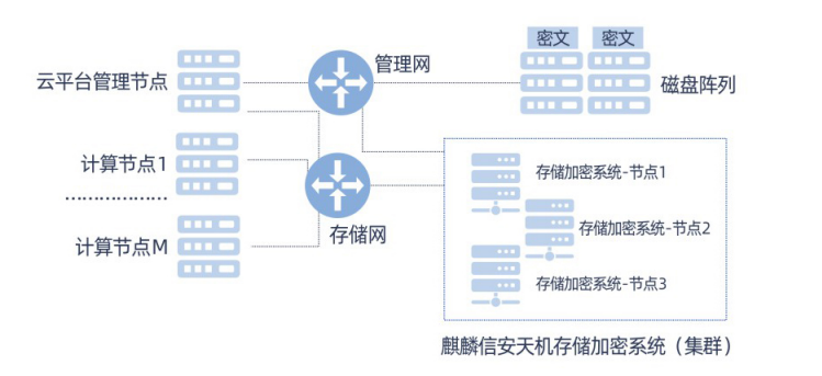 系统基于云平台动态存储管理组件设计开发专用驱动,为云平台虚拟机提供磁盘扇区级加密保护服务。系统加密服务工作在底层存储和云平台管理节点之间,对云平台完全透明。