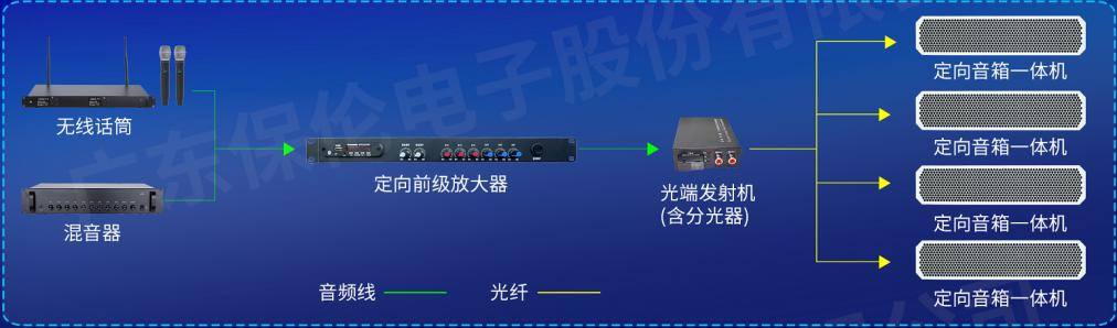 定向音箱一体机之间可通过手拉手光纤连接,无需矩阵分配器和大量的模拟音频线,无需冗繁设备及复杂布线,施工便捷。