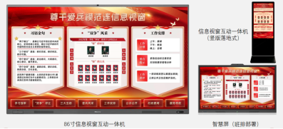 信息视窗管理系统是集信息发布、视窗交互、内容管理、设备集控于一体的综合信息管理平台,基于会议平板、智慧屏等智能交互终端,为部队日常管理、文化宣传、学习教育、视听娱乐、信息共享提供可听、可视、可触新媒介,助力部队营造政治导向鲜明、战斗气息浓郁、奋进格调高昂的政治文化氛围。