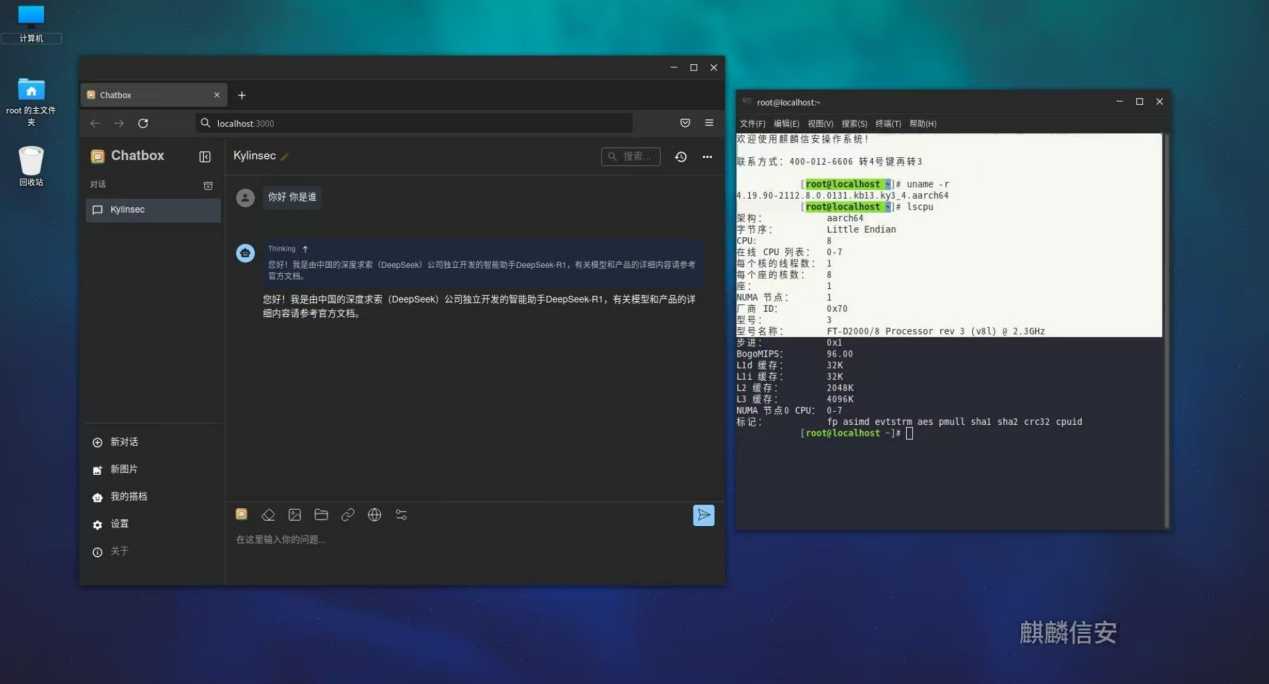 近日,麒麟信安在飞腾CPU国产终端上成功部署麒麟信安桌面操作系统+DeepSeek -R1,实现了从硬件、操作系统到大模型应用的全栈国产化技术闭环!麒麟信安桌面操作系统在“自主创新+智能应用”方面迈出关键一步,将为广大用户带来更加智能、高效的使用体验。