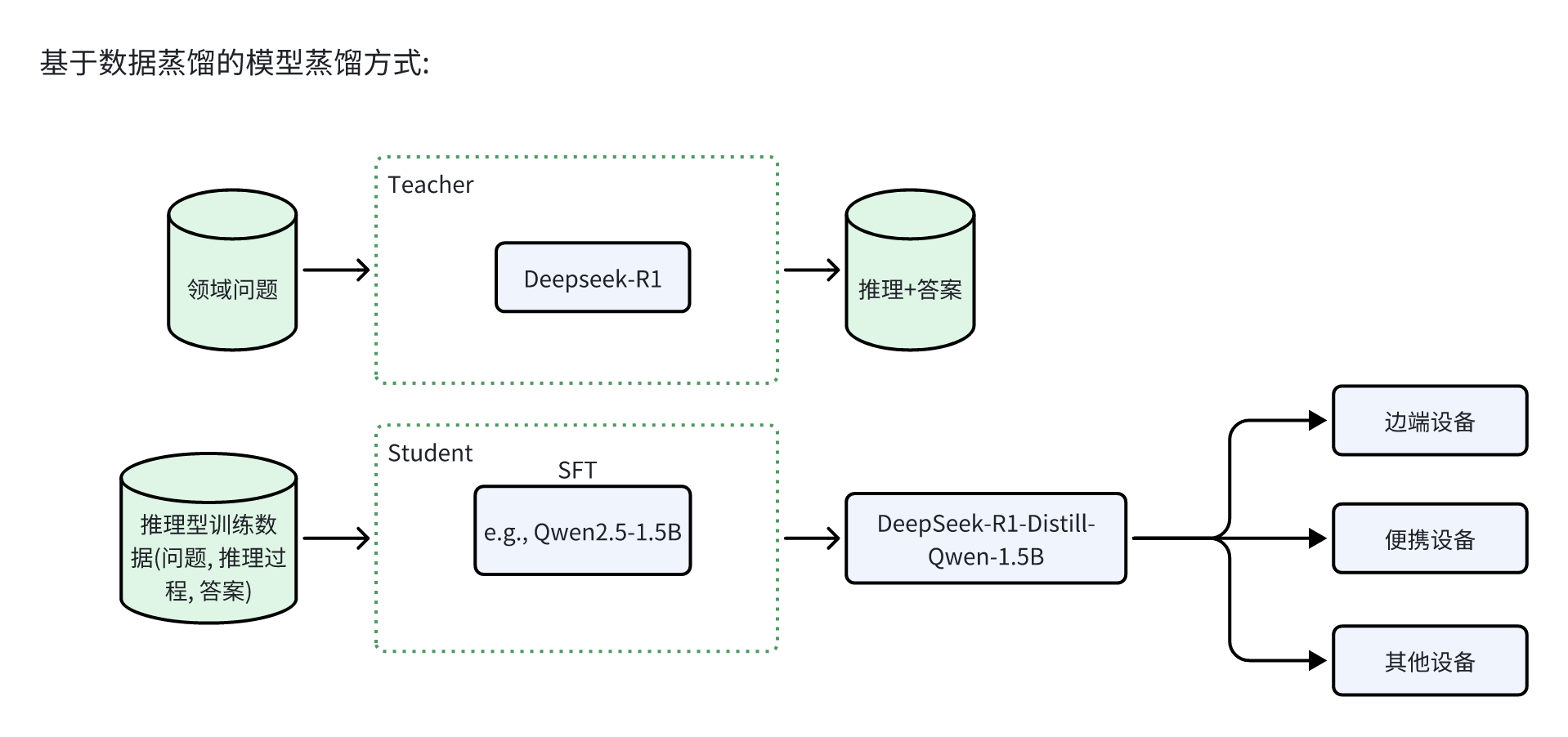 通过大模型(e.g.DeepSeek-R1)生成大量推理过程,包括数学计算、代码推理等任务的详细答案。这些答案不仅包含最终结果,还包括完整的推理链条,帮助小模型理解解题逻辑和推理过程。