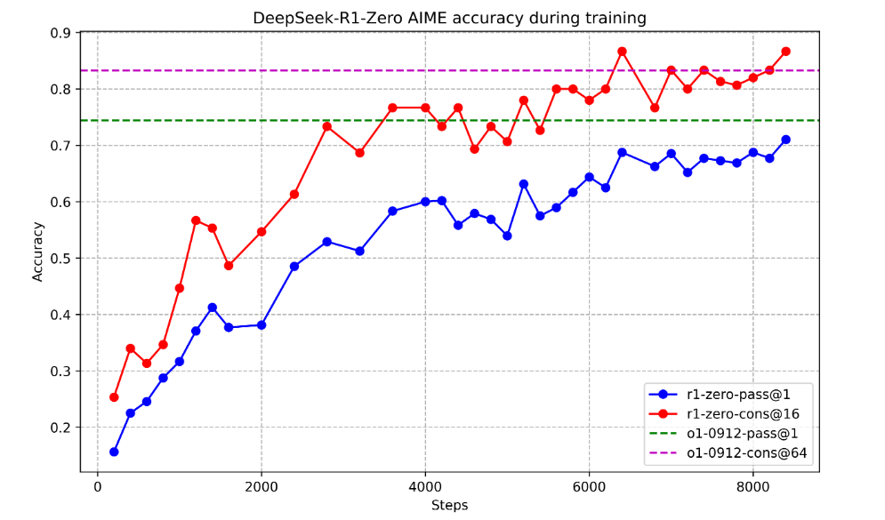 传统观点认为,要让大语言模型 (LLM) 具备强大的推理能力,监督微调 (SFT) 是必不可少的预备步骤。 就像给学生上课,先要用大量的标注数据“喂饱”模型,让它学习推理的 “套路”。然而,DeepSeek-R1-Zero 却打破了这个“定律”。它在DeepSeek-V3-Base的基础上直接应用GRPO进行纯强化学习 (Pure RL) 训练,并在训练过程中观察到模型的持续性能提升和自我进化(自我验证、反思以及生成长思维链等能力)。DeepSeek-R1-Zero的提出,首次公开研究证实:通过纯强化学习(RL)可以激励大型语言模型(LLMs)的推理能力。
