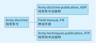 军种条令 美国陆军认为条令含有职业军人所必须熟知的专业知识,对于集体而言,条令是美陆军转型发展的依据。美陆军条令先后出现了训练手册(DM)、野战服务规则(FSR)、野战协定手册(FMI)和陆军战术、技术和程序(ATTP)等多种条令出版物。2019年美陆军为了实现自身转型,决定将陆军条令出版物和陆军条令参考出版物进行合并,以减少冗余,同时继续修订陆军野战手册(FM)和陆军技术出版物(ATP)。目前,美陆军条令自上而下分为ADP、FM和ATP。