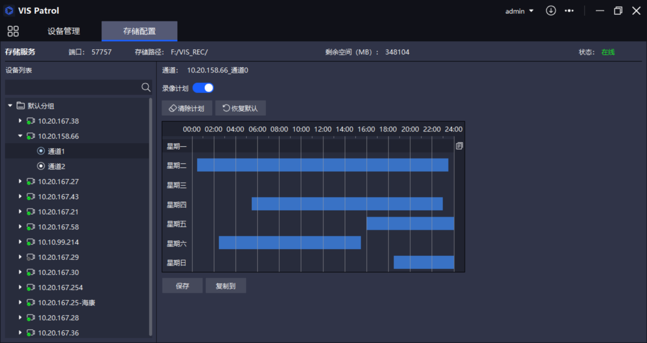 软件内置NVR录像服务,最多支持64路视频同时录制,并可按计划录像、回放查阅和下载。