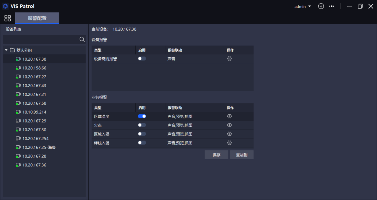 联合设备端,软件支持多种类型报警,包括:设备离线报警、温度异常报警、区域入侵报警、绊线入侵报警、火点报警等,同时支持多种联动方式,包括:响铃、预览、抓图、录像、邮件以及IO联动,并配有报警记录信息管理模块,用于查阅报警详细信息或事后报警原因追溯,构建全方位、立体化报警监控体系。