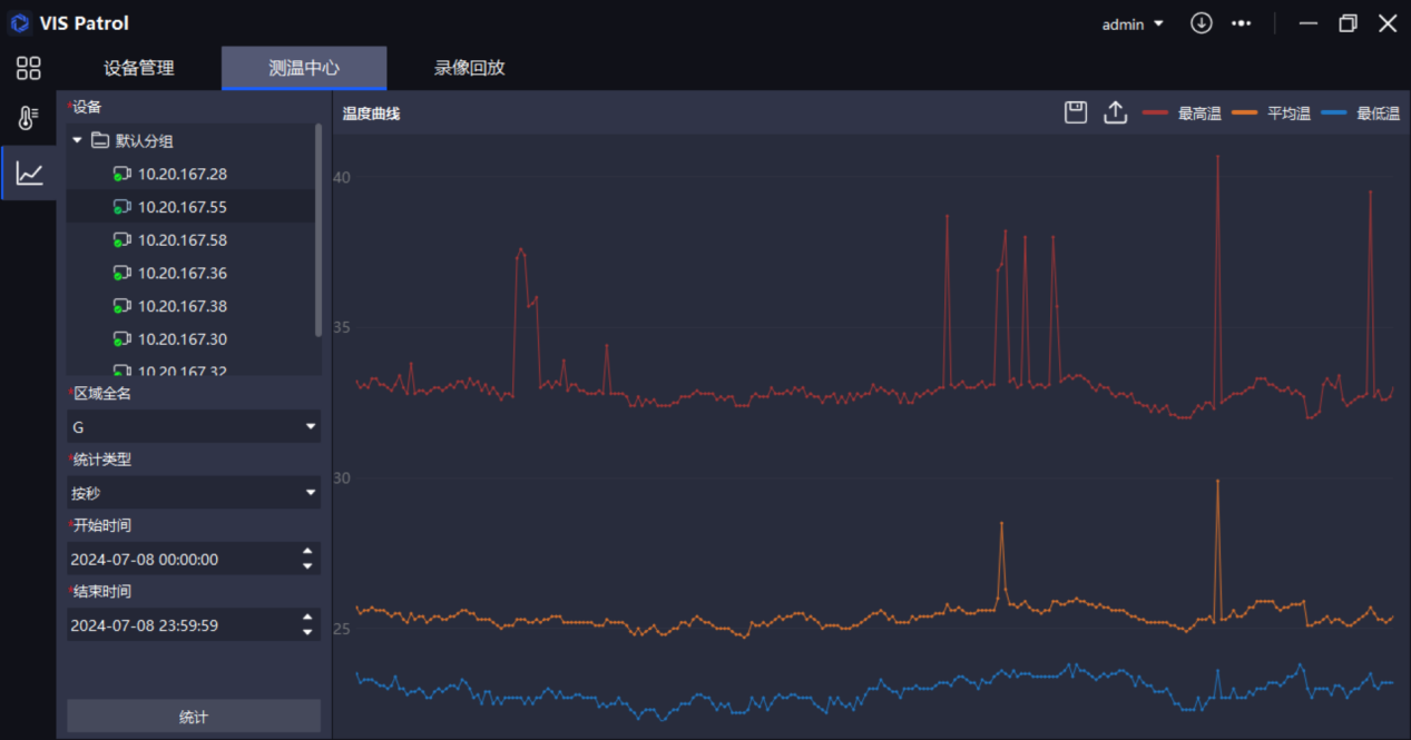 对具备红外测温能力的设备,软件支持周期性采集整帧及各个测温规则区域的温度数据,包括最高温、最低温和平均温。软件内的温度管理模块,可长期(31天)保存温度数据,并支持生成温度变化趋势曲线,分析温度变化规律。