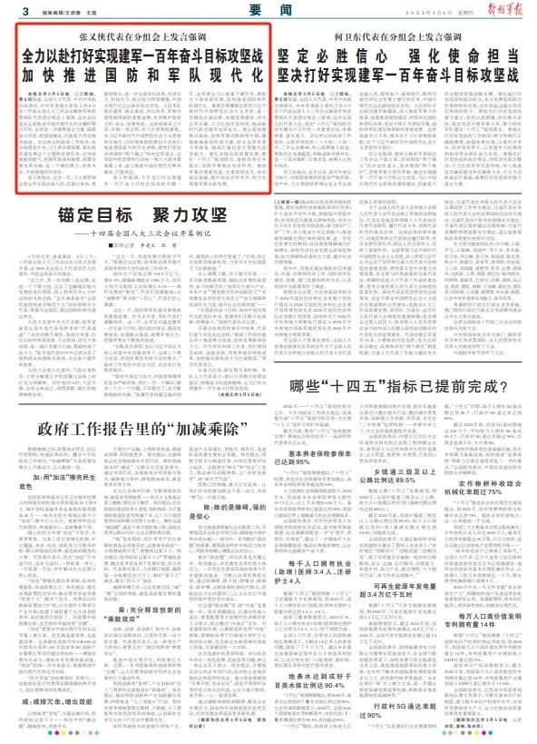 解放军报北京3月5日电(记者欧灿、费士廷)全国人大代表、中共中央政治局委员、中央军委副主席张又侠5日在十四届全国人大三次会议解放军和武警部队代表团分组会上强调,这次会议是在全面推进中国式现代化的关键时期召开的,必将进一步凝聚意志力量、砥砺奋斗攻坚,把强国建设、民族复兴伟业推向前进。会议审议的政府工作报告,充分体现党中央、习主席决策部署,紧扣高质量发展这个主题和首要任务,总结成就鼓劲提气,把握形势谋局施策,部署发展变革突破,是一个增信聚力、求真务实、开新图强的好报告。