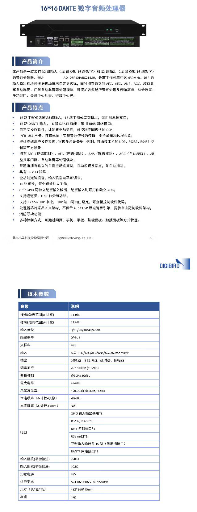 小鸟(DIGIBIRD)16*16DANTE数字音频处理器DB-UniMeeting-AP-M1-1616DWXX-01