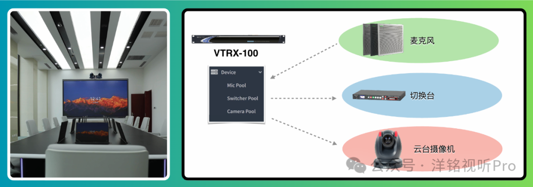 在决策会议室中,VTRX系统搭配吸顶麦克风、智能追踪云台摄像机和iCAST 10NDI 5路网络IP切换台,构建智能声像追踪视听系统。吸顶麦克风全方位音频采集,洋铭智能追踪云台摄像机自动调整与构图,为远程参与者提供如临现场的视觉体验,iCAST 10NDI 5路网络IP切换台支持高清视频流传输和录制,提升会议效率和质量。