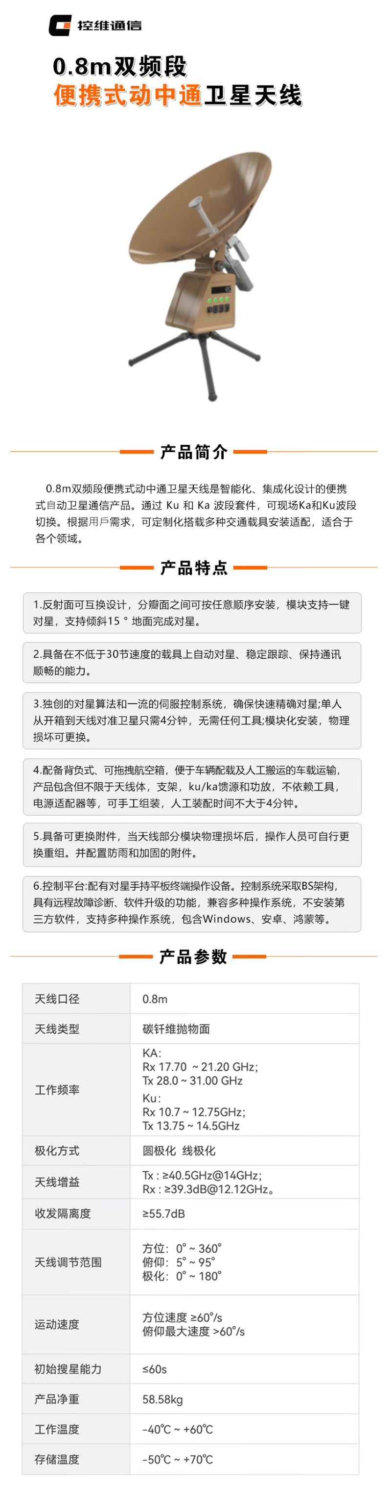 控维通信 0.8m双频段便携式动中通卫星天线